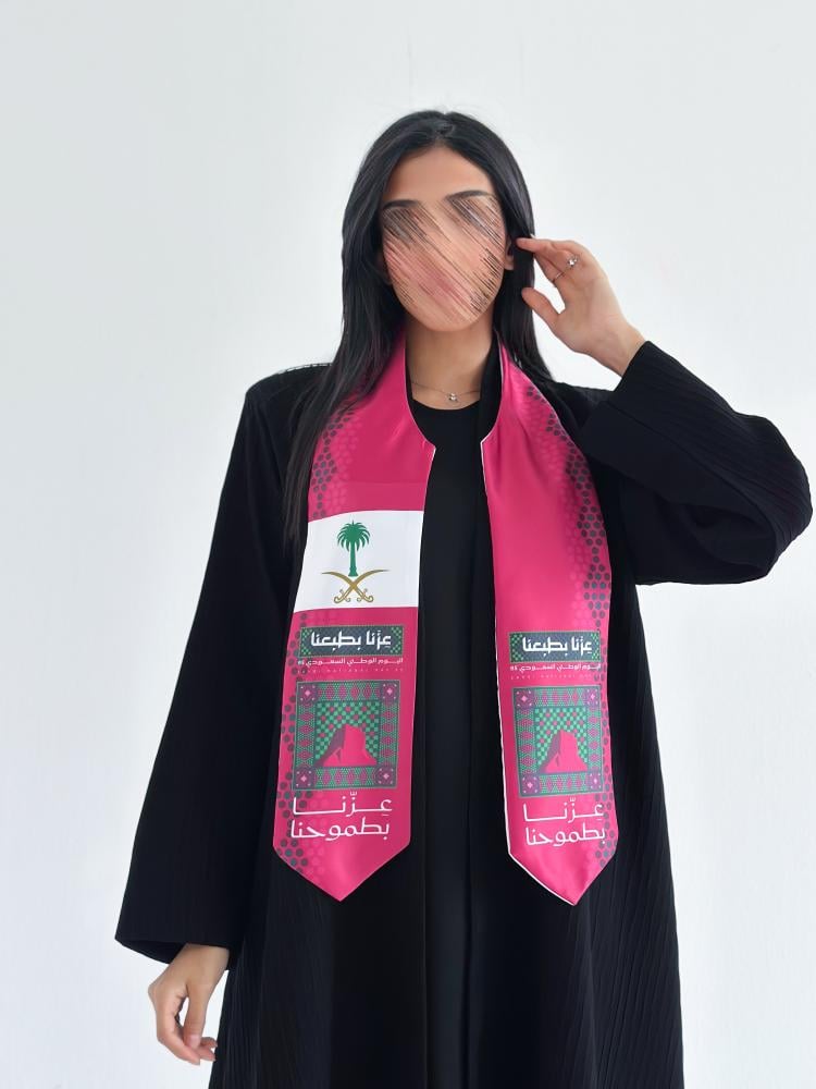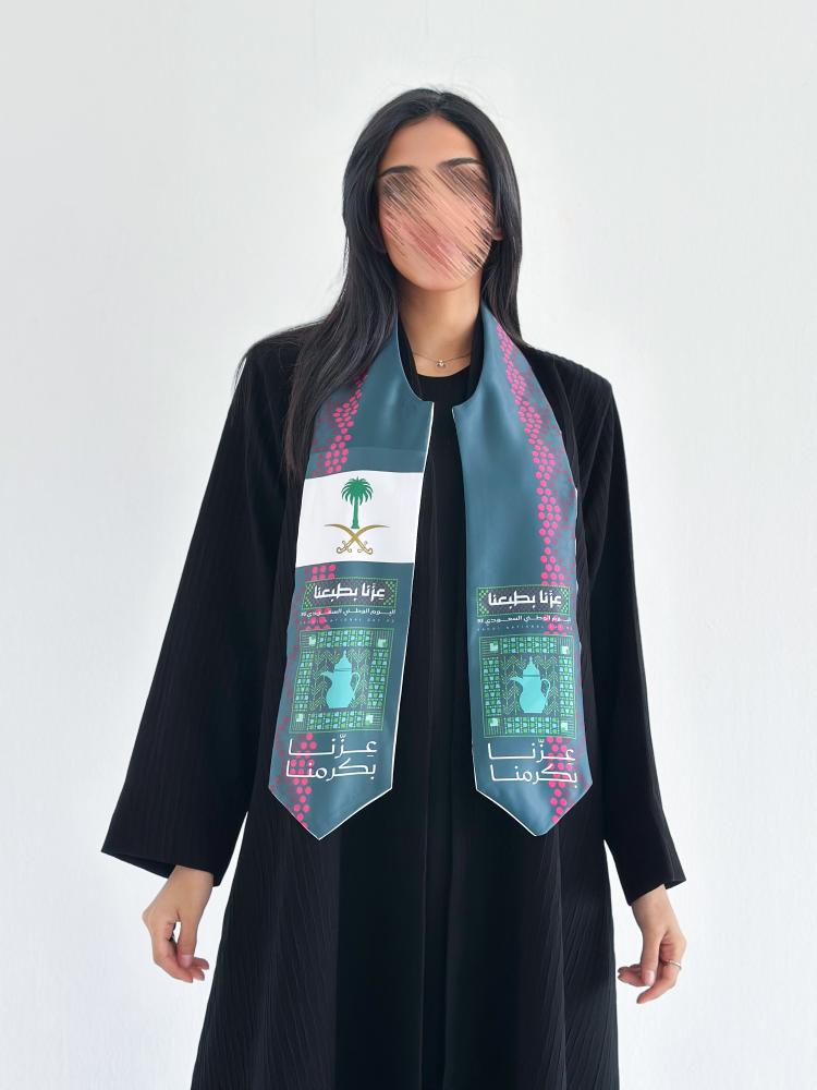 وشاح اليوم الوطني 0088 بتصميم مستوحى من الهوية السعودية وخامة خفيفة مريحة. حجم عملي للتنسيق مع العبايات وإطلالة مناسبة للاحتفال والمشاوير اليومية.